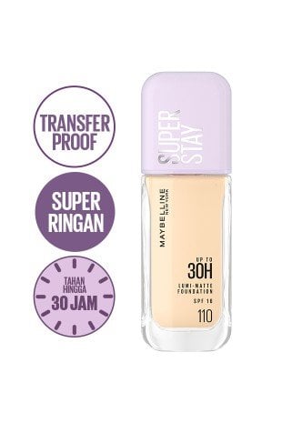 TRANSFERPROOF TAPI SUPER RINGAN! Baru! Maybelline Superstay Lumi-Matte Foundation. Foundation cair yang Transferproof, Super Ringan dengan buildable coverage. Memberikan hasil luminous matte yang tahan lama hingga 30 jam*. No Dempul! Hadir dalam 12 shades yang cocok untuk Skin Tone Indonesia. Dermatologist tested. Allergy tested. Non-comedogenic. Aman untuk semua jenis kulit. Sweat Proof & Waterproof. *Uji Instrumen 37 Subjek
