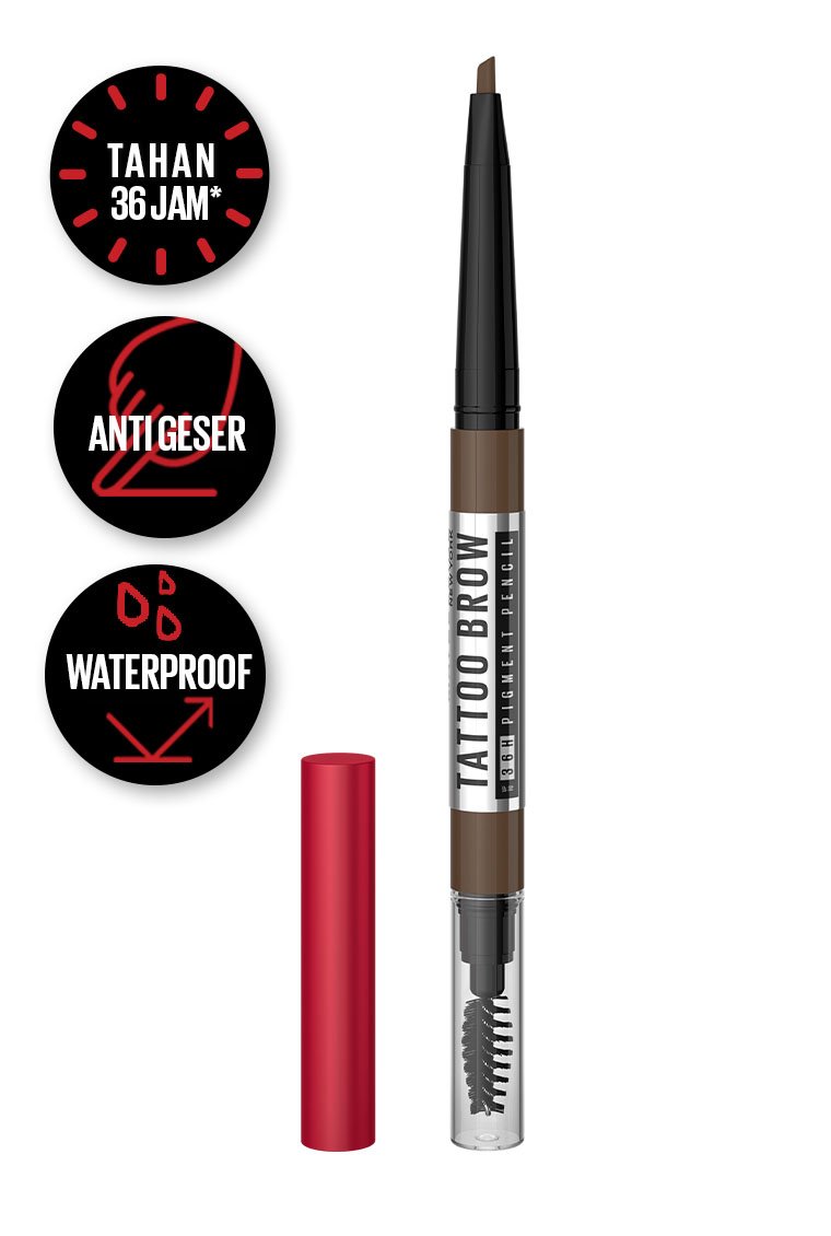 Maybelline Tattoo Brow 36H Pencil inovasi baru produk pensil alis yang tahan hingga 36 jam. Bentuk alis natural dengan formula waterproof serta smudgeproof bahkan di cuaca panas dan berkeringat sekalipun. Pensil alis yang bagus untuk pemula karena mudah digunakan. Pensil alis ini juga sudah dilengkapi dengan spoule yang halus sehingga mempermudah proses palikasi. Tersedia dalam 4 varian warna Dark Brown, Natural Brown, Grey Brown, dan Light Brown.